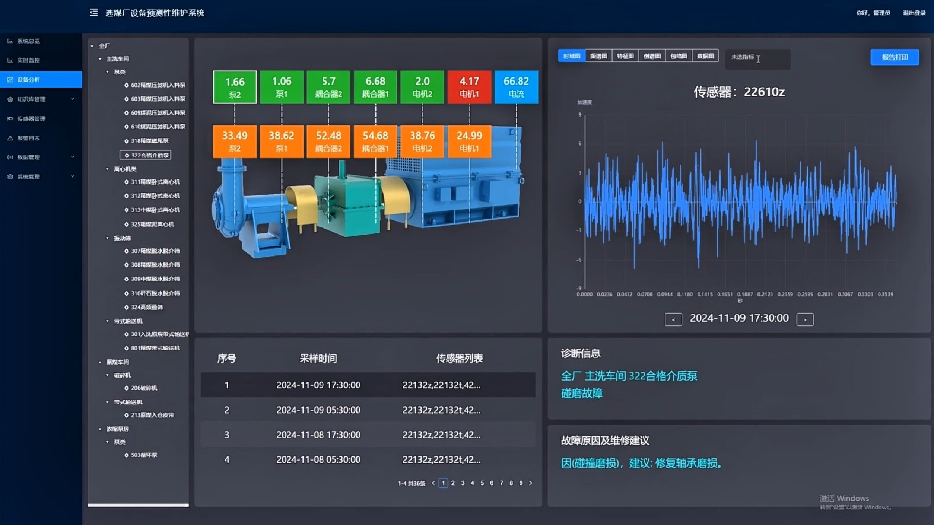 產(chǎn)品簡介:選煤廠設備預測性維護系統(tǒng)實時采集選煤廠生產(chǎn)設備的多維數(shù)據(jù)(溫振數(shù)據(jù)、電氣數(shù)據(jù)、設備實時數(shù)據(jù)、設備管理數(shù)據(jù)、音視頻數(shù)據(jù)),利用先進數(shù)字信號處理算法、人工智能算法、專家知識庫等方法對設備進行實時監(jiān)測、故障分析和故障溯源。在設備出現(xiàn)異常時,能夠分析出異常原因,給出合理維修建議,生成維修報告并白動推送給檢修人員,指導檢修人員進行設備維護,實現(xiàn)流程化閉環(huán)管理。選煤廠設備預測性維護系統(tǒng)可早期發(fā)現(xiàn)設備異常,實現(xiàn)由“事后維修”向“預知檢修”的轉(zhuǎn)變,從而實現(xiàn)設備維護安全損失最小、總維護成本最低、總維修時間最少。