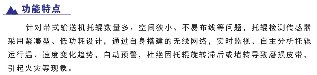 托輥是帶式輸送機中數(shù)量最多的組成部件,在運行過程中,由于托輥停轉(zhuǎn)與皮帶發(fā)生摩擦引起發(fā)熱,最終引發(fā)火災(zāi)的事故層出不窮。無線組網(wǎng)的托輥溫速度檢測裝置可在線監(jiān)測托輥的轉(zhuǎn)速、軸溫變化趨勢,及時反映當前托輥的運行狀態(tài),代替人工巡檢,為帶式輸送機的穩(wěn)定運行保駕護航。